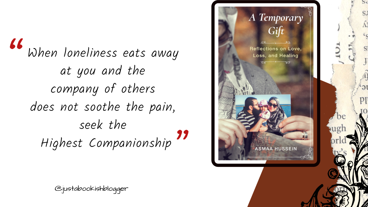 The book starts off with an introduction explaining Asma’s brief journey with Amr. Her unexpected meeting, her marriage and his sudden death. The book is then divided into eight parts including the epilogue documenting her thoughts and journey on overcoming grief while being a single parent. What I loved most about this book is that her thoughts are coupled with uplifting verses from the Qur’an and examples of hadith. It is for this reason that reading her book gives us a reason to hold on to a thread of hope in a rather dismal world.
